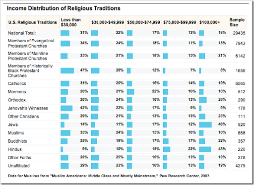 Income Distribution of Various religions: 43% of Hindus are in Highest Income Group($100,000 Plus) second only to Jews who are at 46%